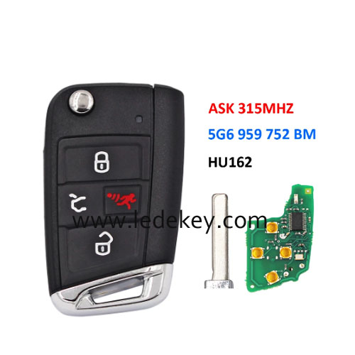 VW 4 button Smart Remote Car Key with HU162 blade ASK 315Mhz MQB AES Chip P/N: 5G6 959 752 BM For Volkswagen Golf Jetta Atlas 2018-2020