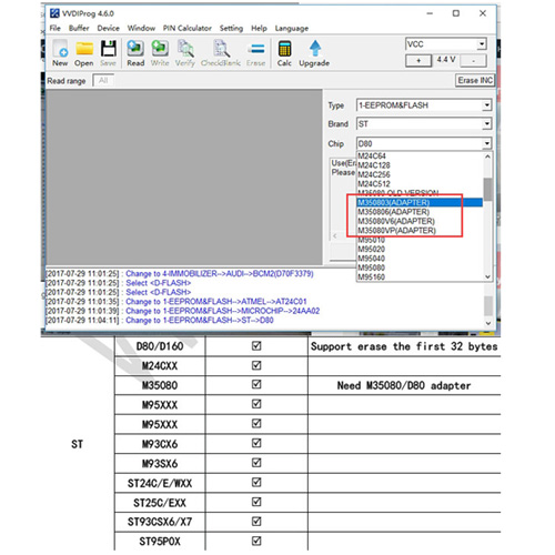 V4.6.0 VVDI Prog Add Function D80(ADAPTER), D160(ADAPTER), M350803(ADAPTER), M350806(ADAPTER), M35080V6(ADAPTER),M35080VP(ADAPTER) options in <1-EEPROM&FLASH>->(Need M35080/D80 ADAPTER),these needs to work with M35080 D80 Adapter.